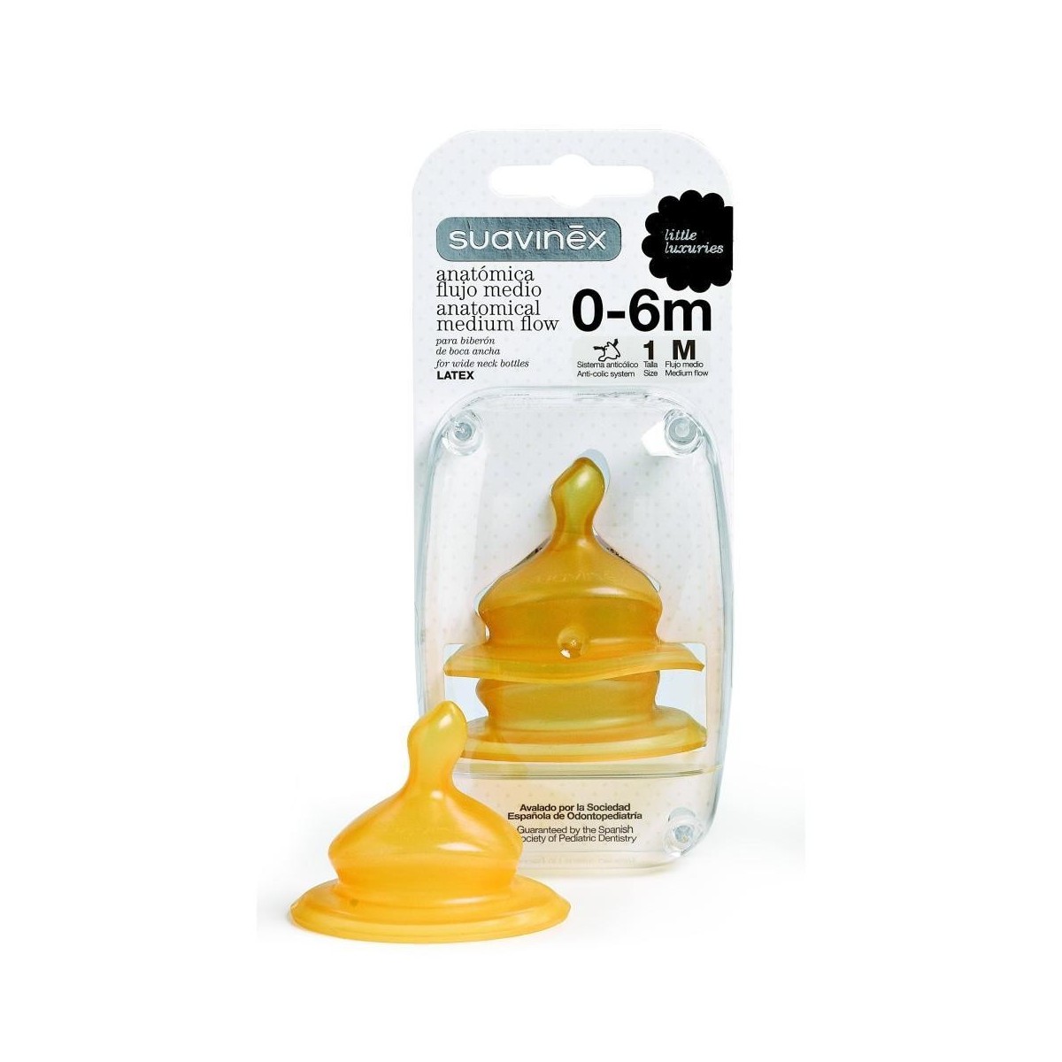 La tetina anatómica de suavinex imita al pezón materno durante la succión. Características: Dispone de unas válvulas en su base que evitan molestias como cólicos e hipo.