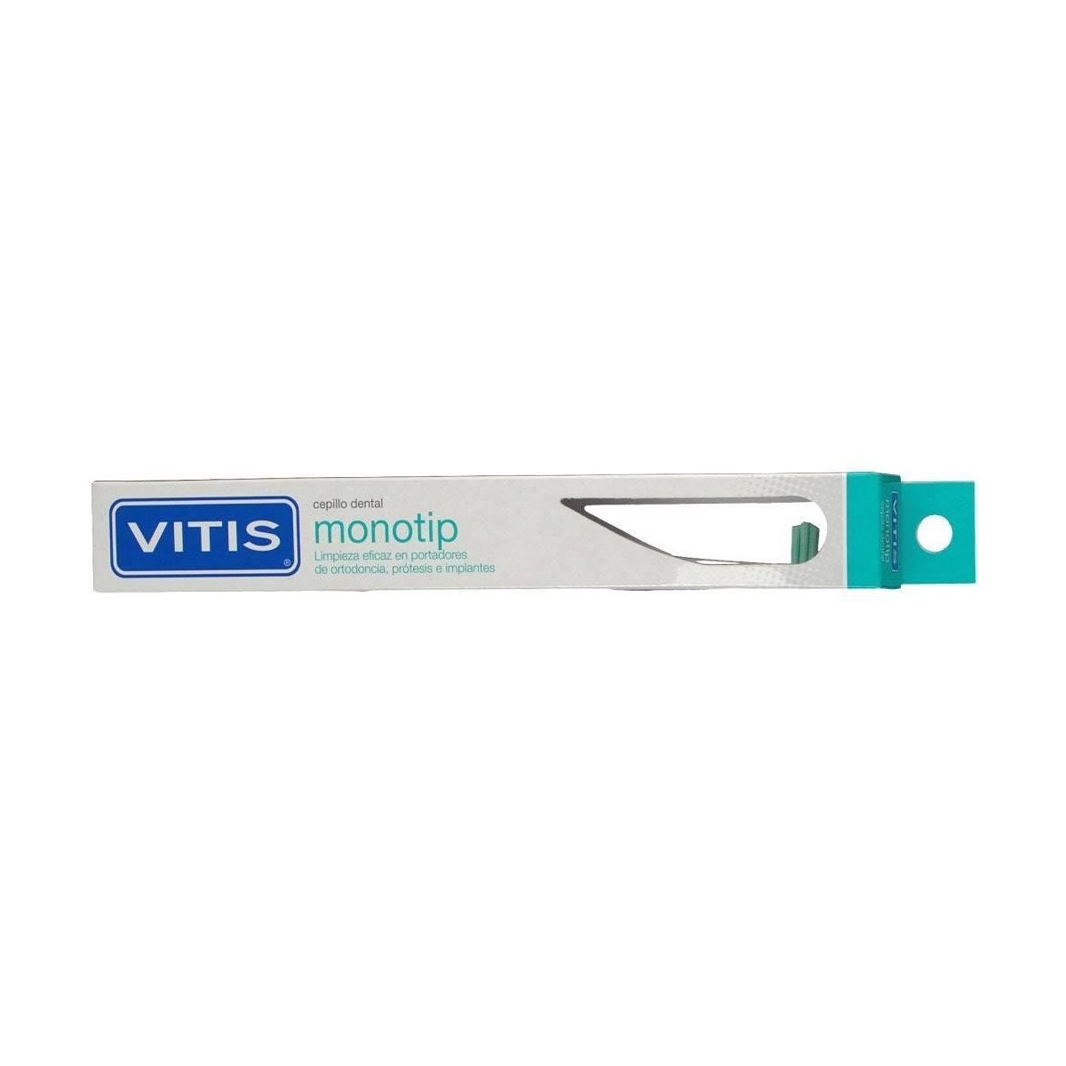 Monotip es un cepillo de dientes especial con una cabeza redondeada que está diseñado para limpiar dientes apretados, puentes fijos y aparatos de ortodoncia. Monotip es un cepillo de dientes de uso diario con cabezal de cepillo redondeado y filamentos de resistencia media que eliminan eficazmente la biopelícula oral (placa bacteriana) de dientes apretados, de espacios interdentales amplios y de espacios abiertos de las extracciones dentales. Sus características especiales facilitan la higiene bucal en personas con prótesis (ya sean fijas o removibles) o implantes, y también se puede usar como un suplemento para limpiar aparatos de ortodoncia. El cuello del Monotip es flexible y puede doblarse a la mejor posición para su boca, para mejorar el acceso al cepillado. El mango es ergonómico y of