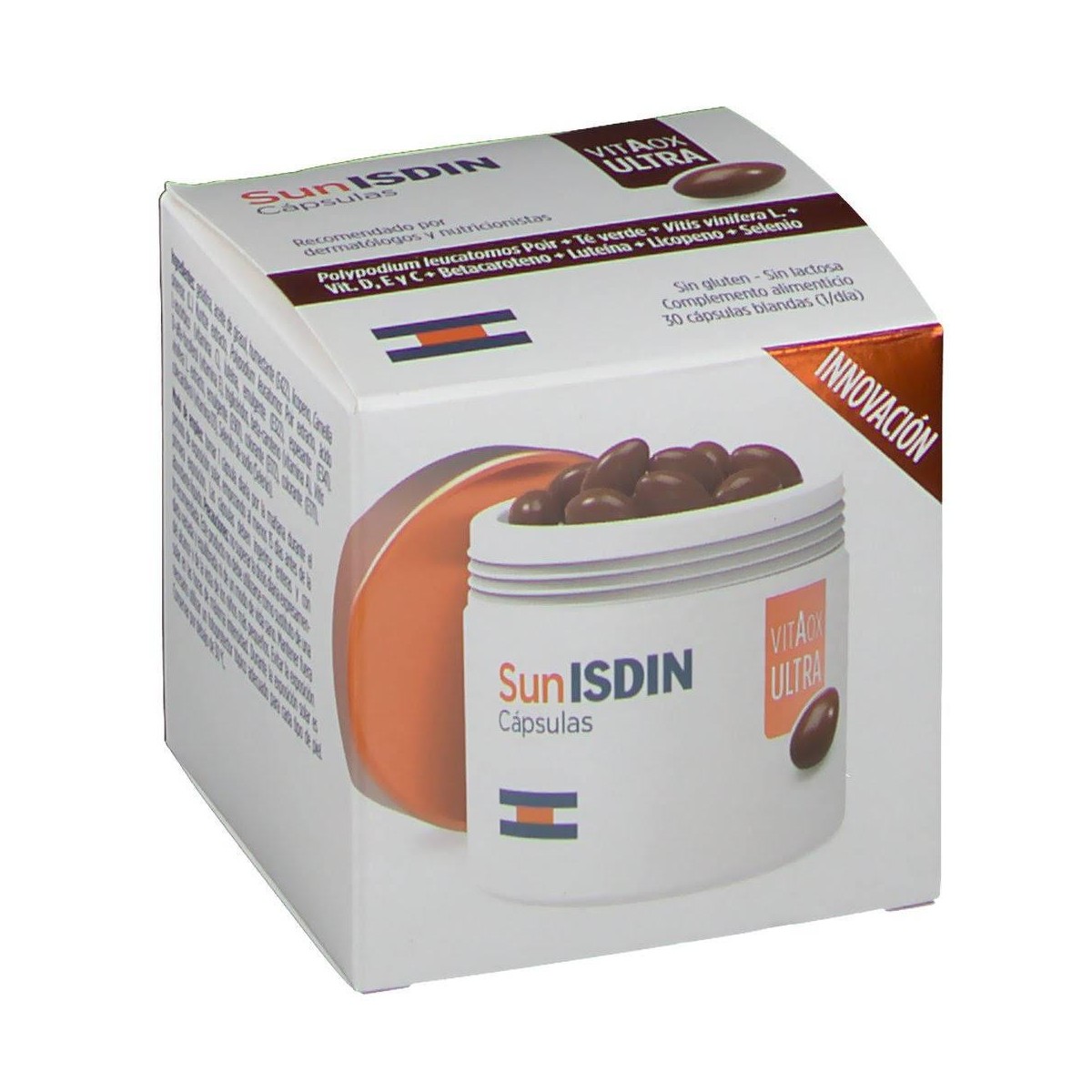 Gelatina, aceite de girasol, humectante (E422), licopeno, Camellia sinensis (L.) Kuntze extracto, Polypodium leucatomos Poir extracto, ácido L-ascórbico (vitamina C), luteína, emulgente (E322), espesante (E341), D-alfa- tocoferol (vitamina E), triglicéridos, beta-caroteno (vitamina A), Vitis vinifera L. extracto, emulgente (E901), colorante (El 72), colorante (El 71), colecalciferol (vitamina D3), Selenito de sodio (Selenio).