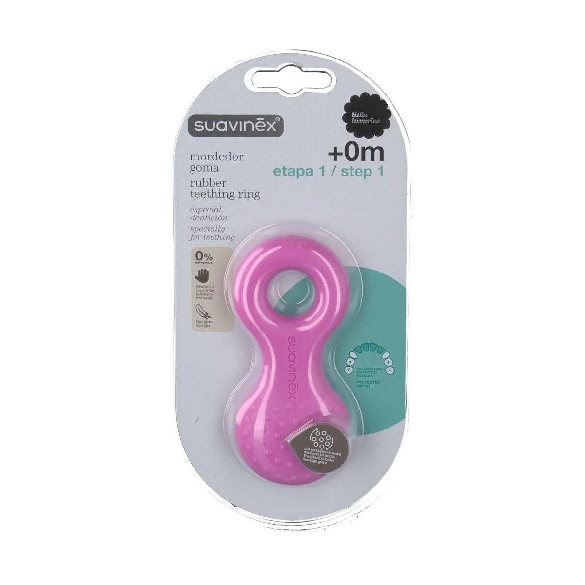 Suavinex mordedor goma etapa 1 +0 meses Suavinex mordedor goma etapa 1 +0 meses El mordedor de goma de Suavinex está especialmente elaborado para ser utilizado desde el primer día de vida del bebé, mejorando progresivamente el desarrollo de los dientes incisivos de leche. Su textura con burbujas alivia considerablemente la inflamación de las encías, aportando un resultado suave, agradable y confortable al tacto del paladar. Indicación Para tu bebé recién nacido Modo de empleo Mantener el mordedor limpio y cuidado para evitar la proliferación de infecciones en la boquita del bebé.