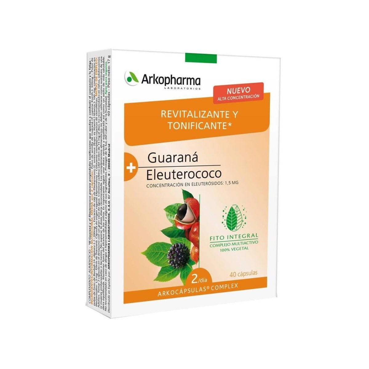 Polvo de semilla de guaraná (P. cupana Kunth.), Polvo de pulpa de fruto de baobab (A. digitata L.), Extracto de raíz de eleuterococo (E. senticosus (Rupr. ex Maxim.) Maxim.), Fibras de manzana. Cápsula de origen vegetal: Hipromelosa, Colorante de origen vegetal: complejos cúpricos de clorofilinas.