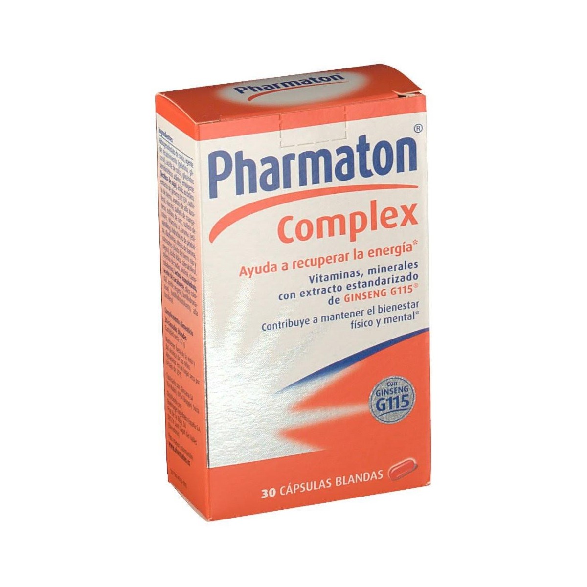 Complemento alimenticio a base de extracto estandarizado de raíz de Panax Ginseng G115, Vitamina A, B1, B2, B3, B6, B5, B9, B12, C, D3, E, Biotina, Hierro, Cobre, Selenio, Manganeso, Cinc y Magnesio. Ayuda a recuperar la energía, contribuye al bienestar físico y mental.
